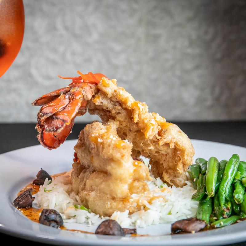 Cornmeal tempura fried, jasmine rice, sourwood honey sriracha aioli, sweet thai chili sauce, sesame-roasted mushrooms and baby green beans.